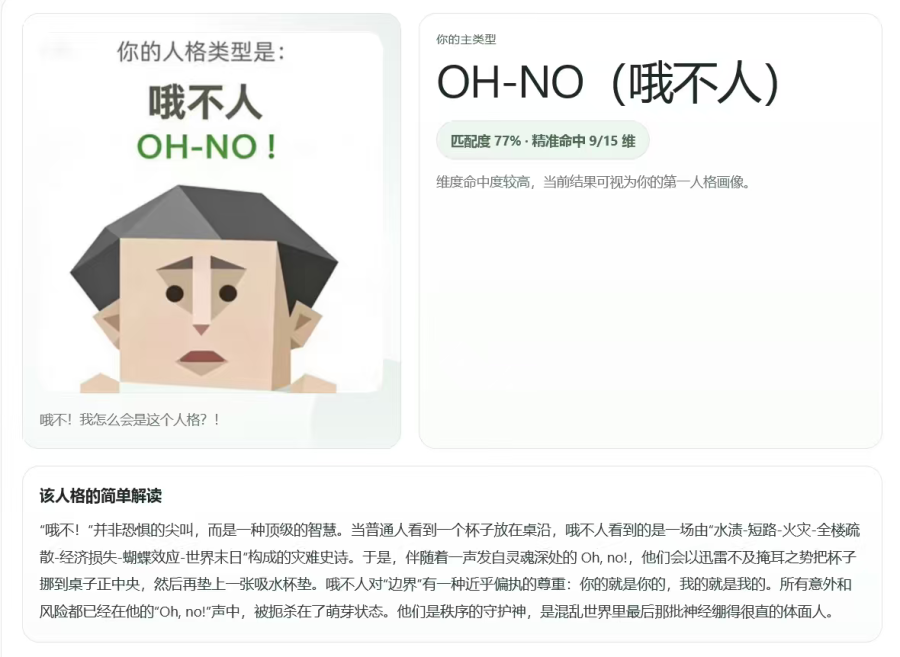 用阿里云函数计算极速搭建了一个专属SBTI测评网站,测试结果显示我的人格类型是:OH-NO(哦不人),测试结果仅供娱乐。
